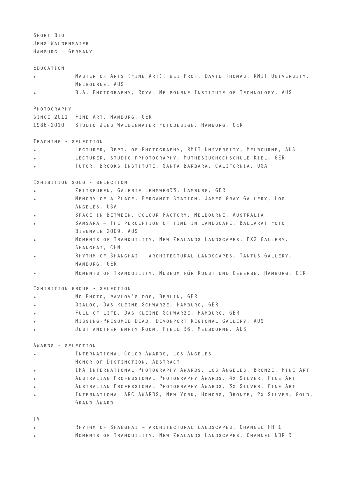 Jens Waldenmaier arbeitet analog, mit langen Belichtungszeiten bis zu 30 Minuten – macht Zeit erfahrbar, bildet das Vergehen von Zeit in seiner Fotografie ab. Er fotografiert aus der Hand mit Mittel- und Großformat. Mehrere unterschiedliche Belichtungen werden übereinander gelegt. Warum analog? Er gibt die Antwort selbst. „Weil es hier um die Abbildung real existierender Dinge geht. Das sollte auch auf einem real existierenden Medium wie Film geschehen, nicht in der flüchtigen, nur mit einer zweifelhaften Realität ausgestatteten digitalen Welt“.